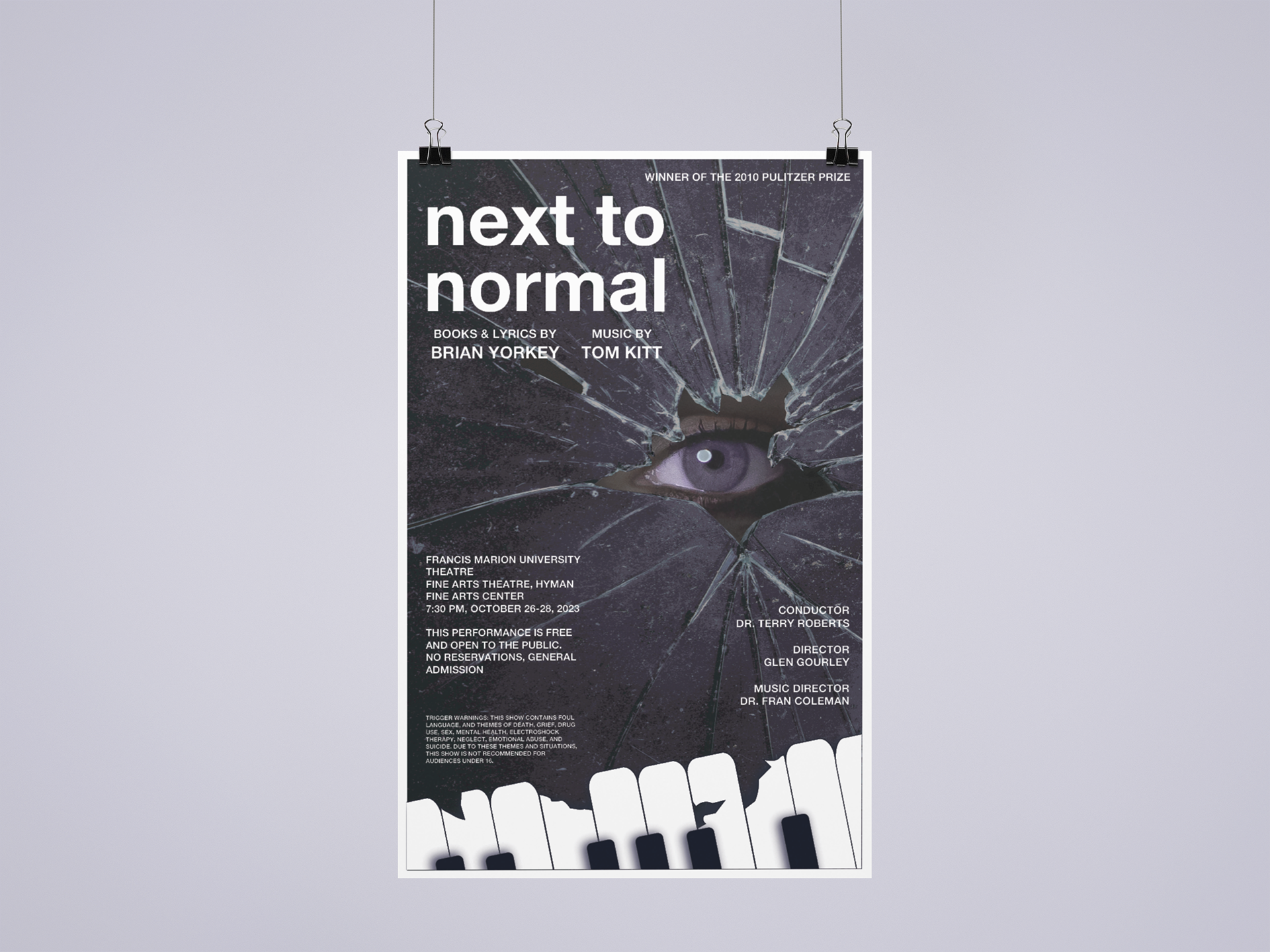 This poster was designed for a competition with the Francis Marion University Theatre Department for their performance of Next to Normal. We were given guidelines to follow, including the sizes for each bit of information and colors to be used. The broken glass symbolizes the broken state of the family in the musical. The piano symbolizes the daughter in the play and the musical aspect of it all.