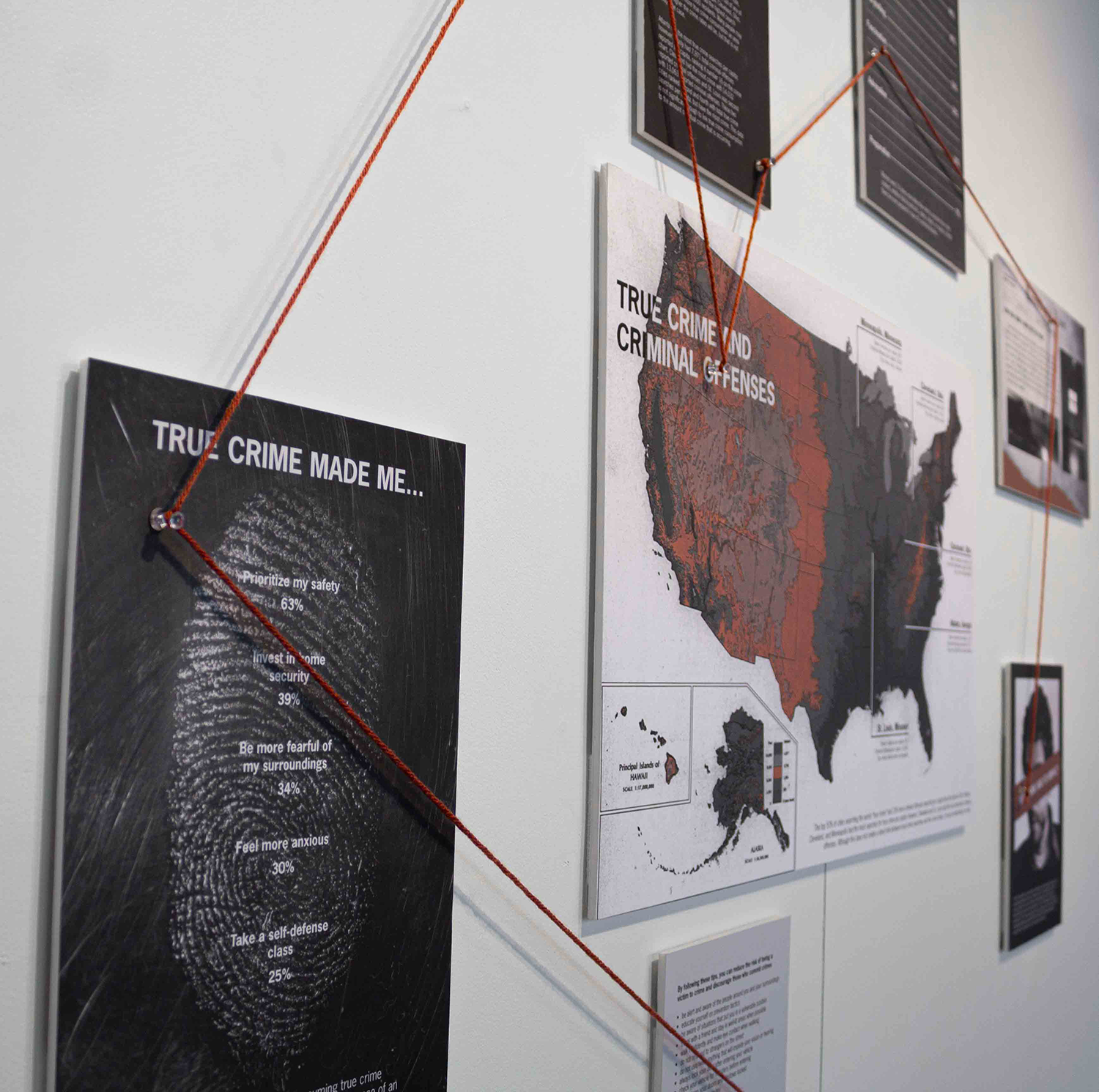 My senior show is about how true crime content impacts the people who view it. I used black, white, and red as my color scheme to go along with the true crime aesthetic. Each poster has information on it about how true crime impacts people, what it makes them do, how often people watch, and how it has impacted crime rates. The intentions of this exhibit was to allow people to form their own opinions about true crime. I used the red string to connect the pieces and mimic an evidence board one might see in the content.
